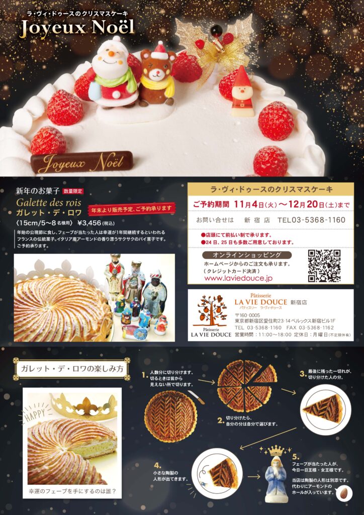 クリスマスケーキの予約について 2025.12.01 日頃よりラ・ヴィ・ドゥースをご愛顧いただきありがとうございます。 11月4日(火)より、クリスマスケーキのご予約を開始致します。 ・ご予約期間 11月4日(火) ~ 12月20日(土)まで ・決済方法 店頭予約の場合、現金またはクレジットカード オンラインショップの場合 クレジットカードのみ ※全て前払い制となりますのでご了承くださいませ。前払い制の為、お電話でのご予約は承れませんので宜しくお願い申し上げます。 ご予約お待ちしております。
